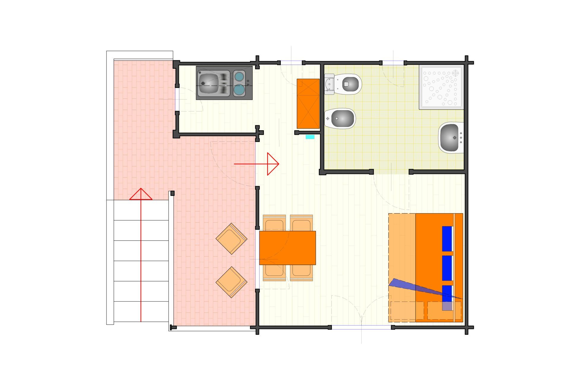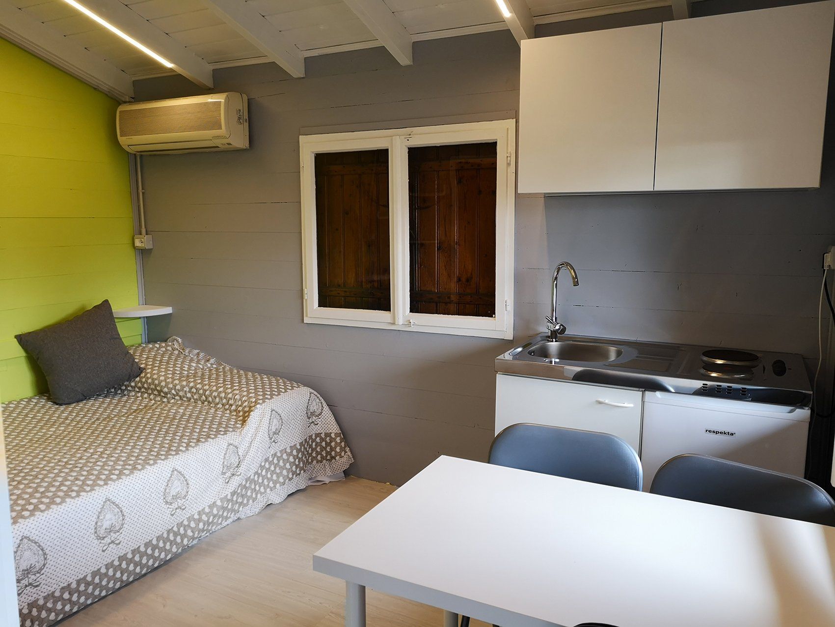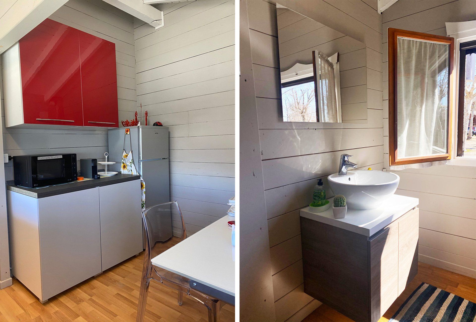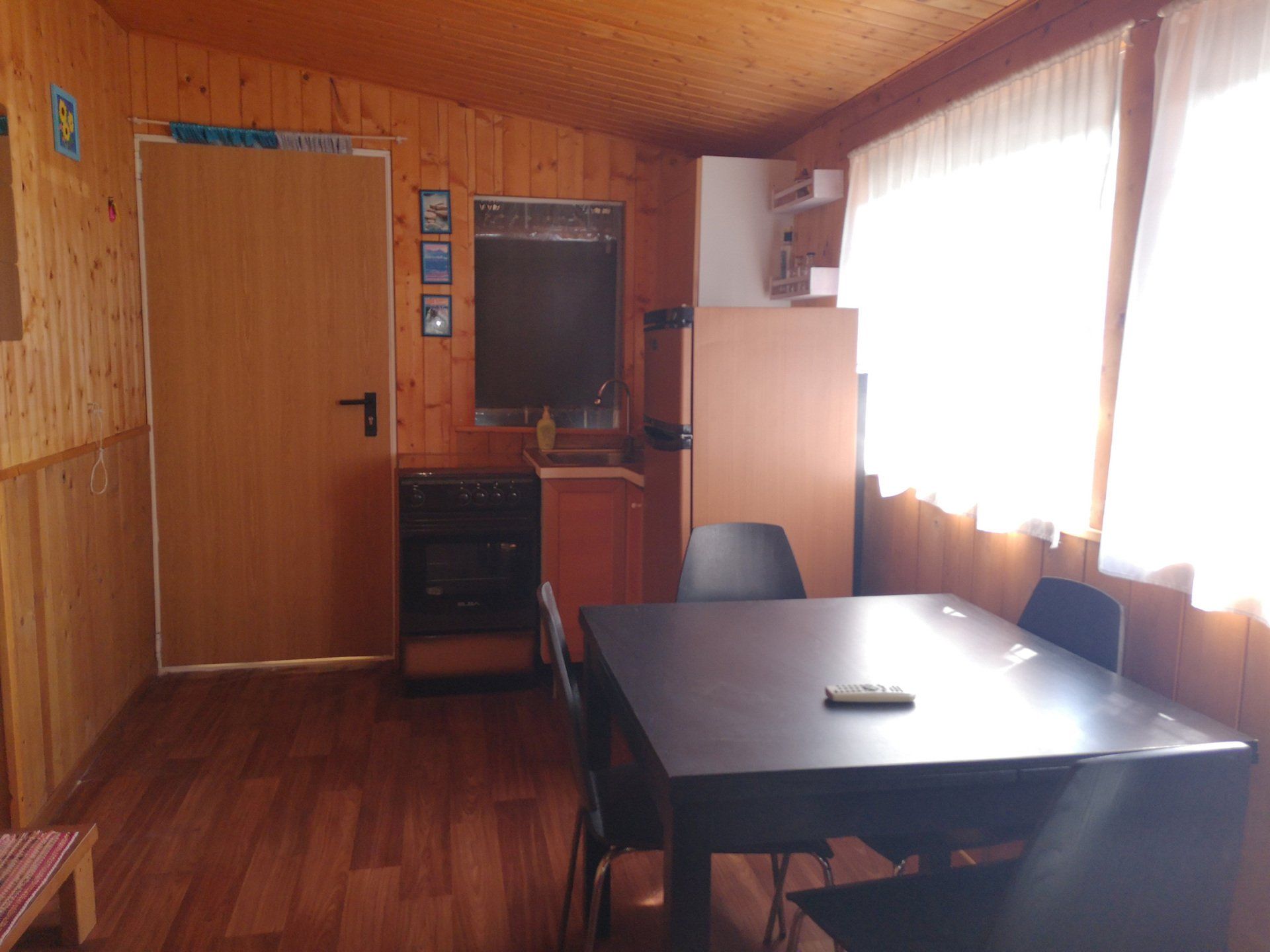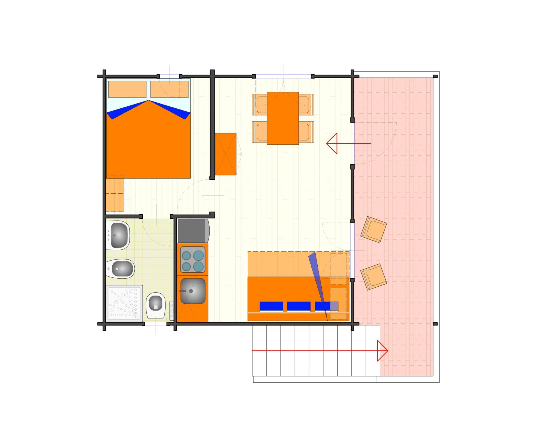 Wooden house of 30 square metres, equipped kitchen, dinette with sofa bed, double bedroom, bathroom with shower. The bungalow has a terrace and is equipped with heating and air conditioning.