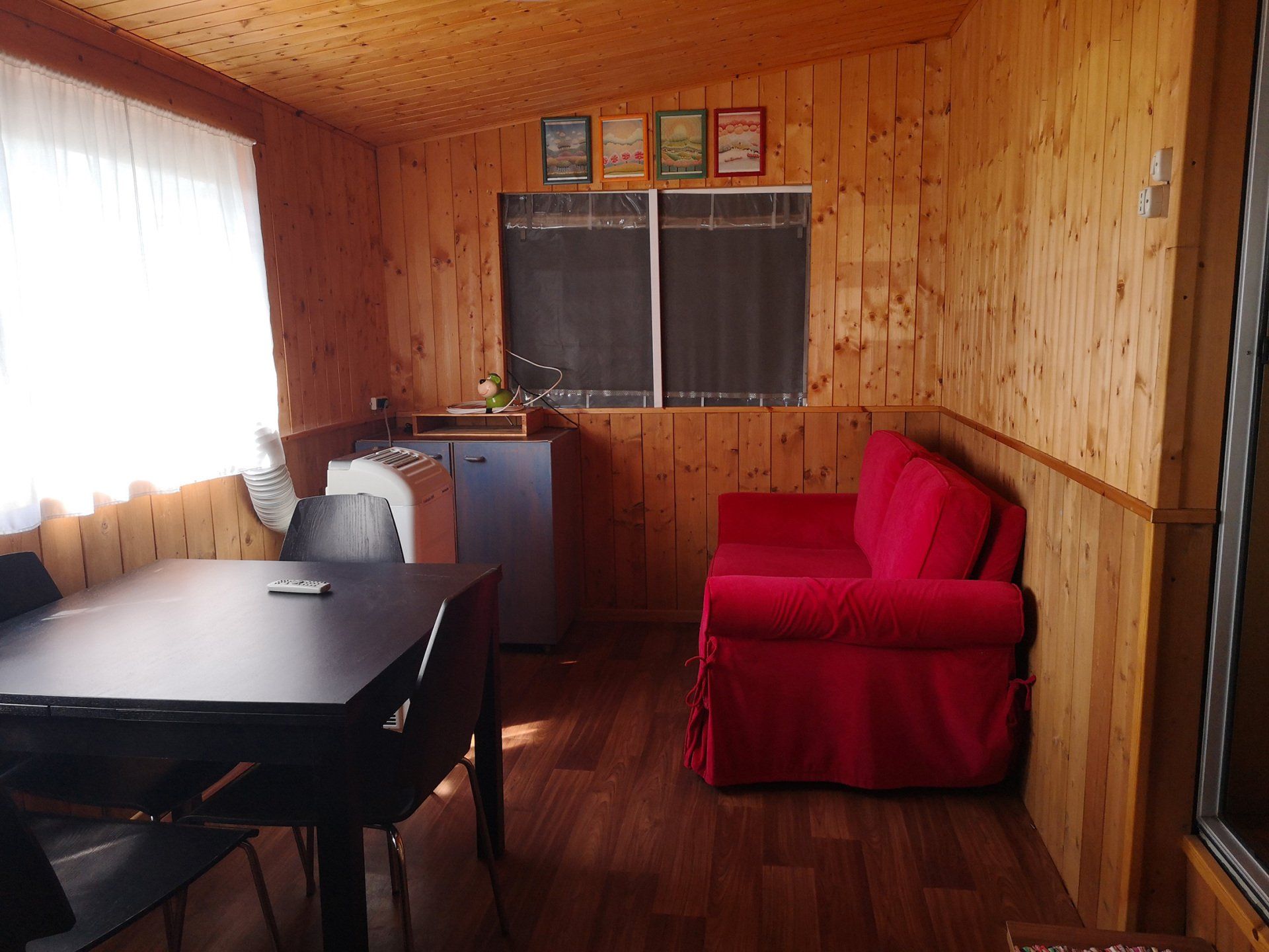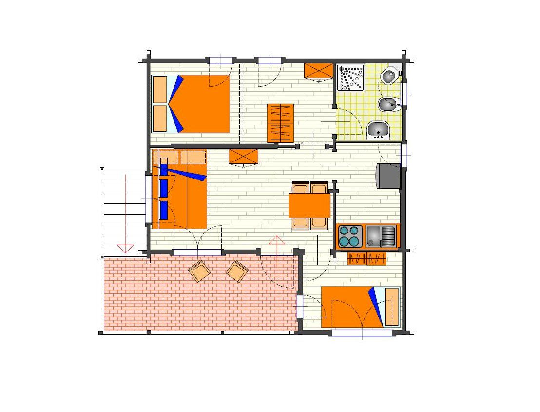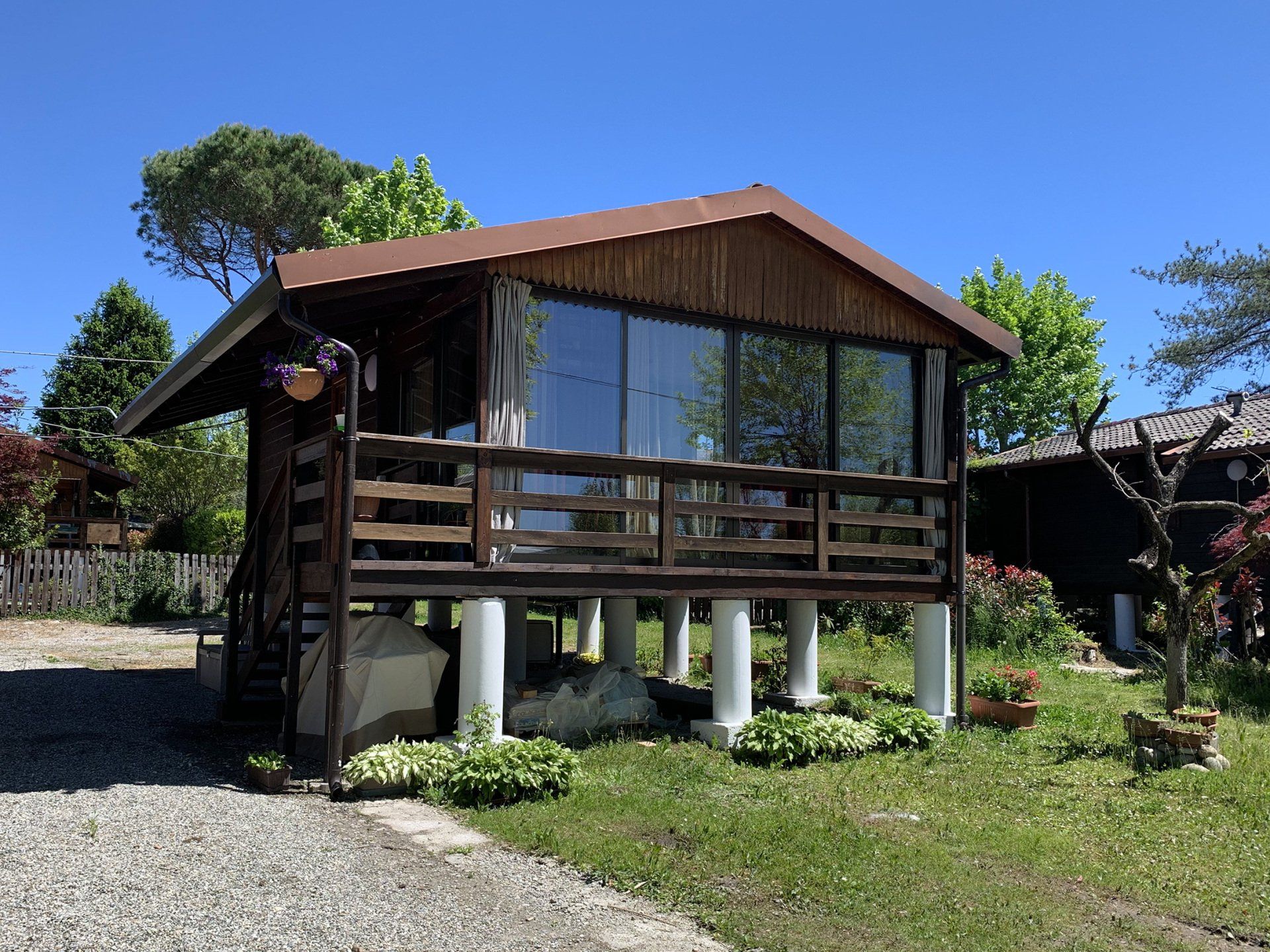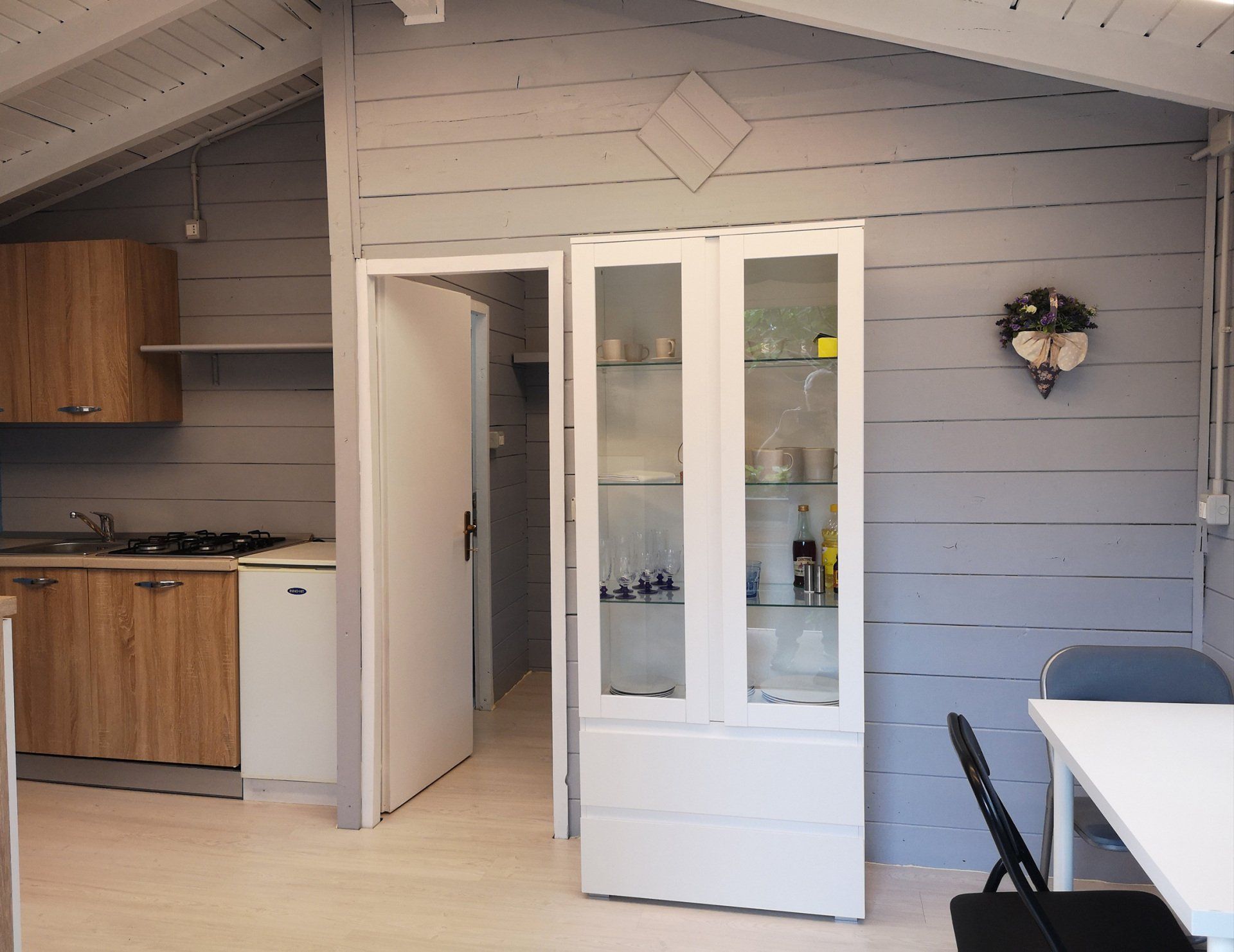 Wooden cottage with equipped kitchen, 2 double bedrooms, one with an additional single bed, bathroom with shower. The villa has an equipped veranda and a lovely private garden. It is equipped with heating and air conditioning.