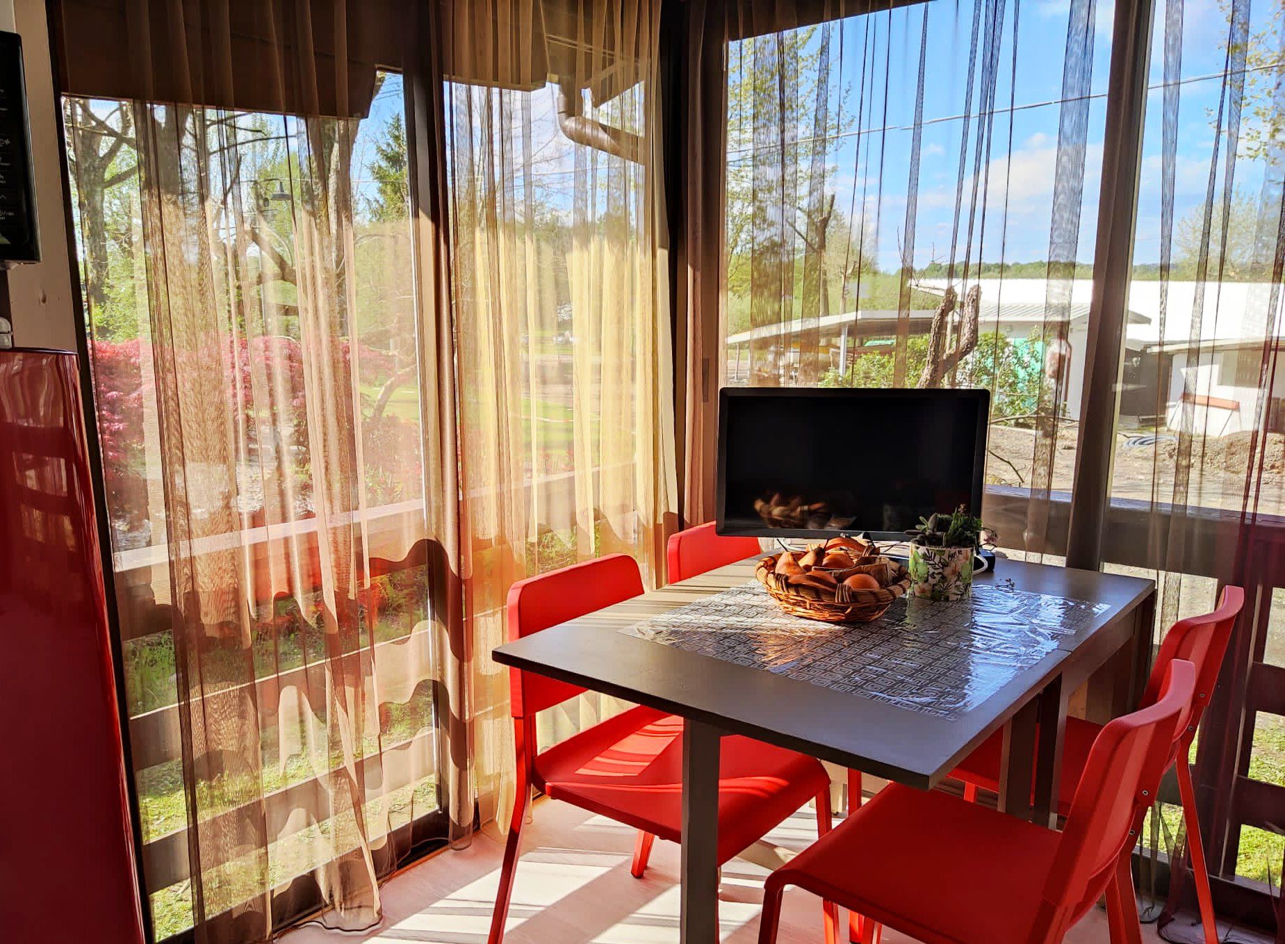 The maxi caravan has a veranda with table and chairs and is equipped with heating and air conditioning.