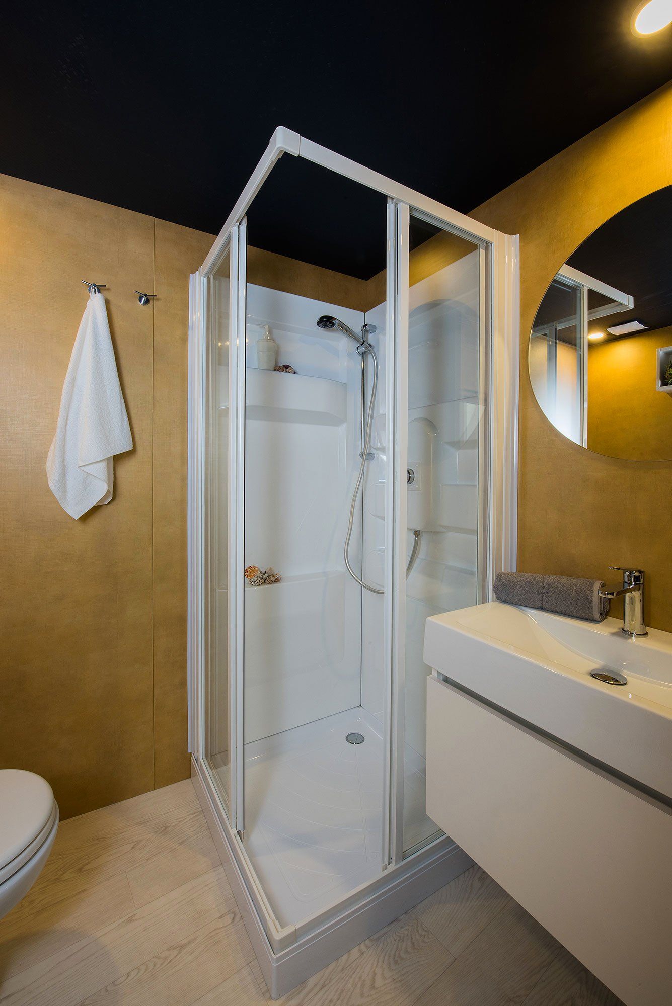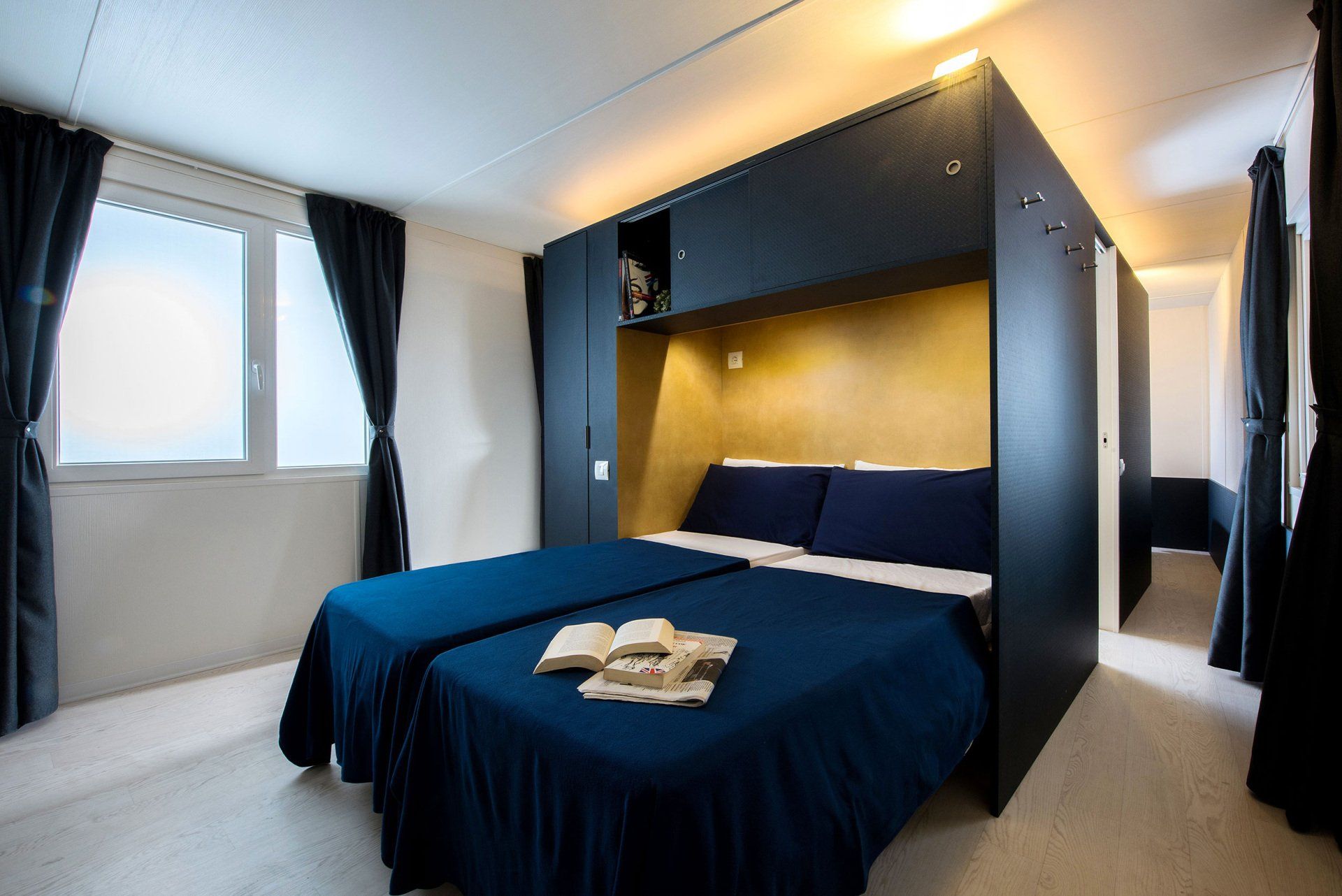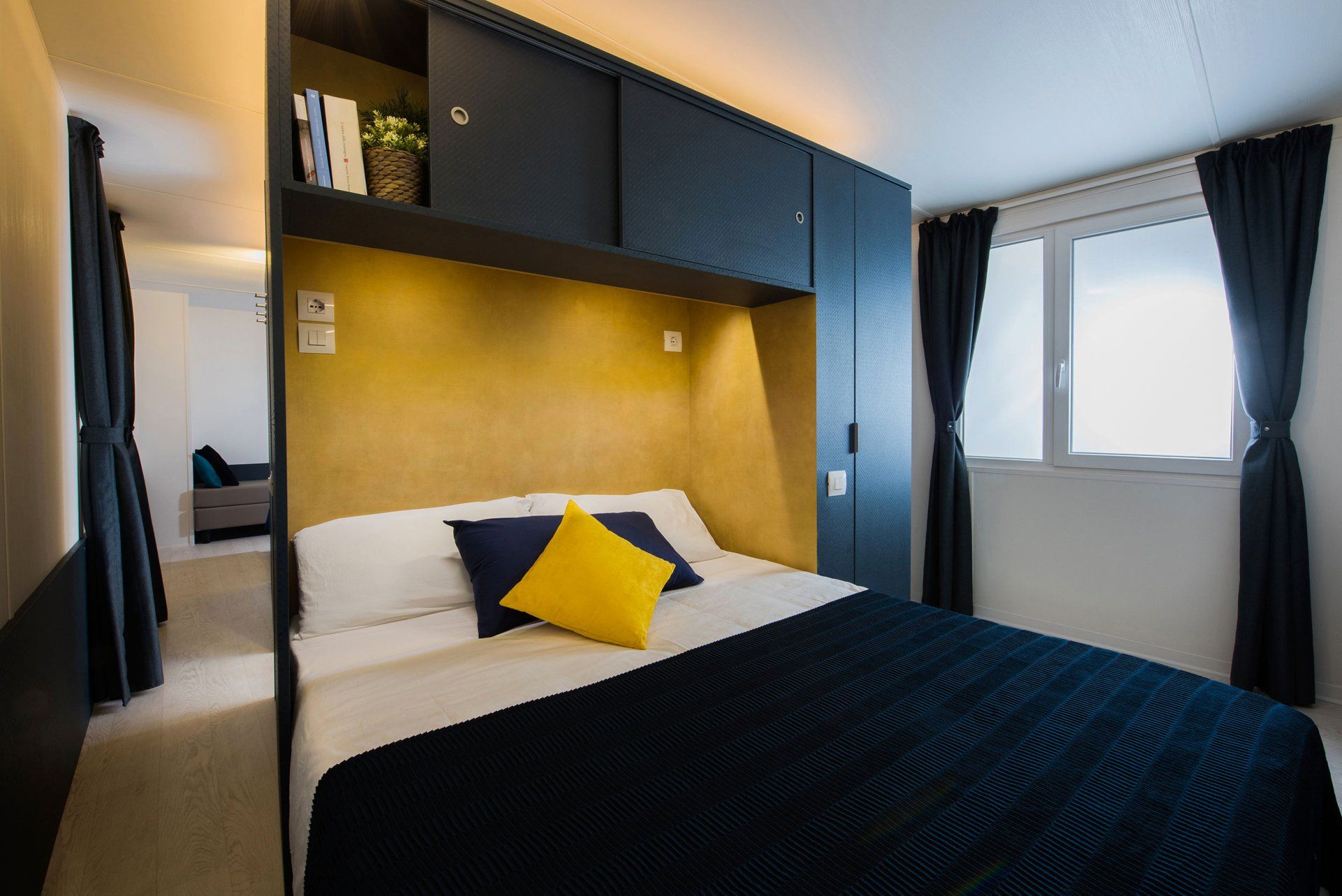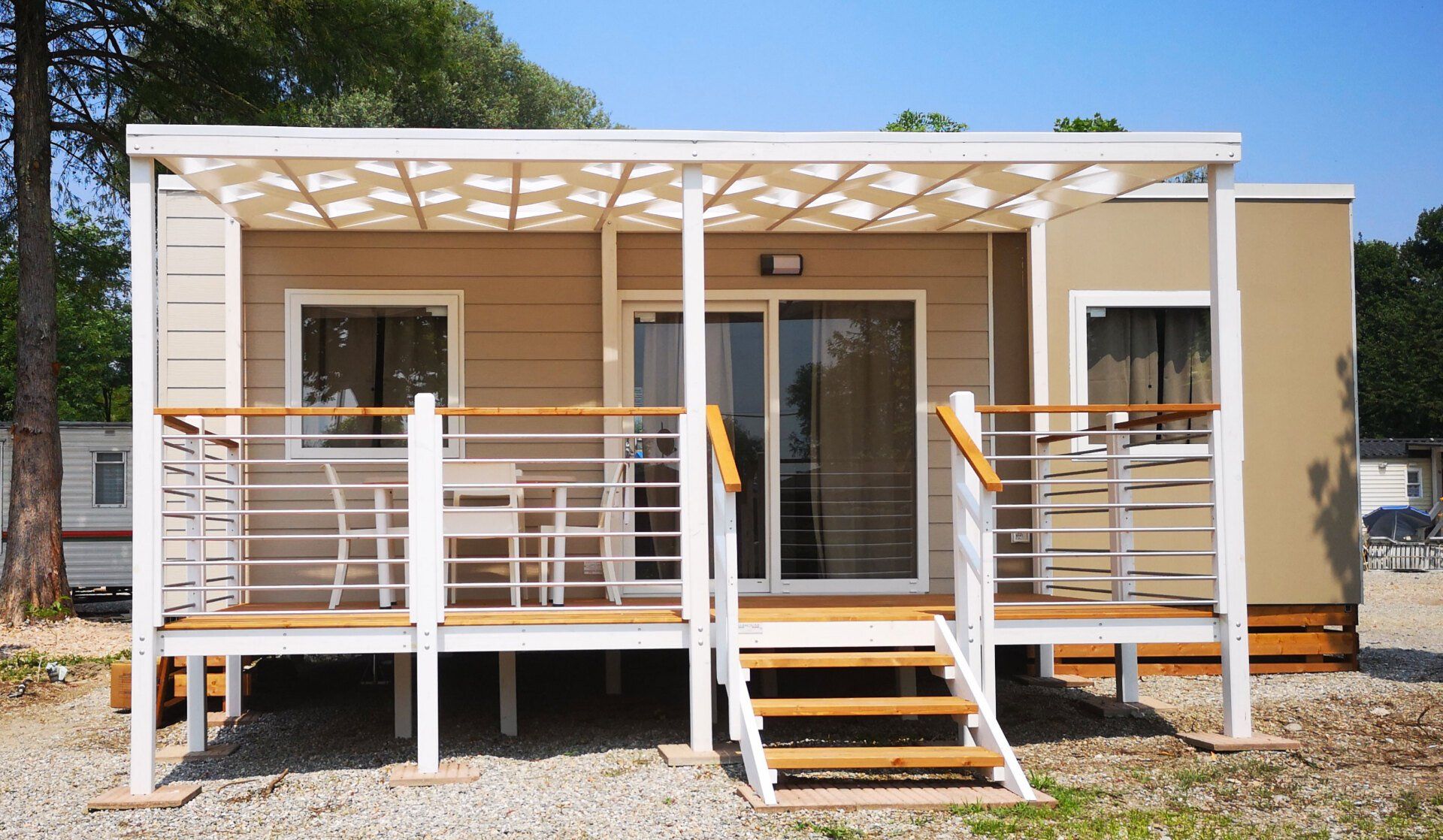 Clean, elegant and modern, the Cleopatra maxi caravan is equipped with a kitchenette, two-burner induction burners, 2 bedrooms with double beds, sofa, table with chairs, bathroom with shower, outdoor veranda and air conditioning.