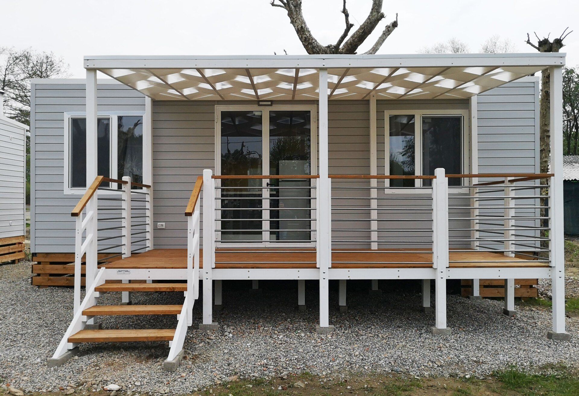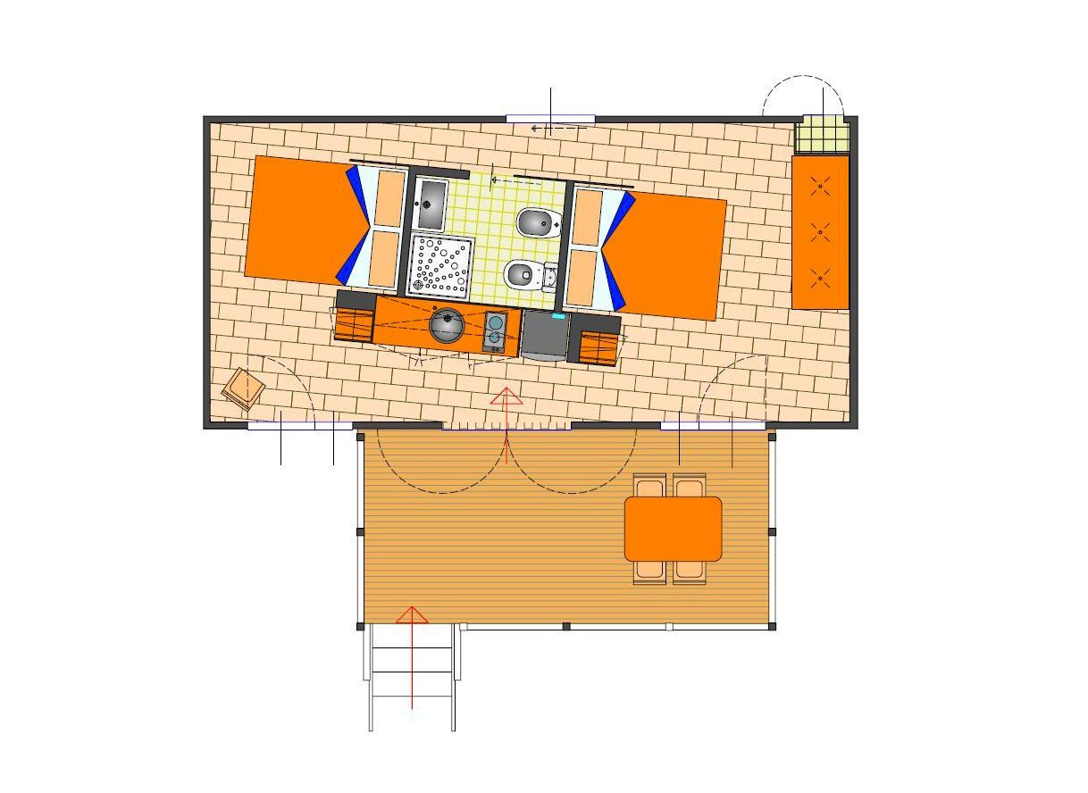 Wooden house of 25 square metres, equipped kitchen, dinette with bed, large bathroom with shower. The bungalow has a terrace and gazebo and is equipped with heating and air conditioning.