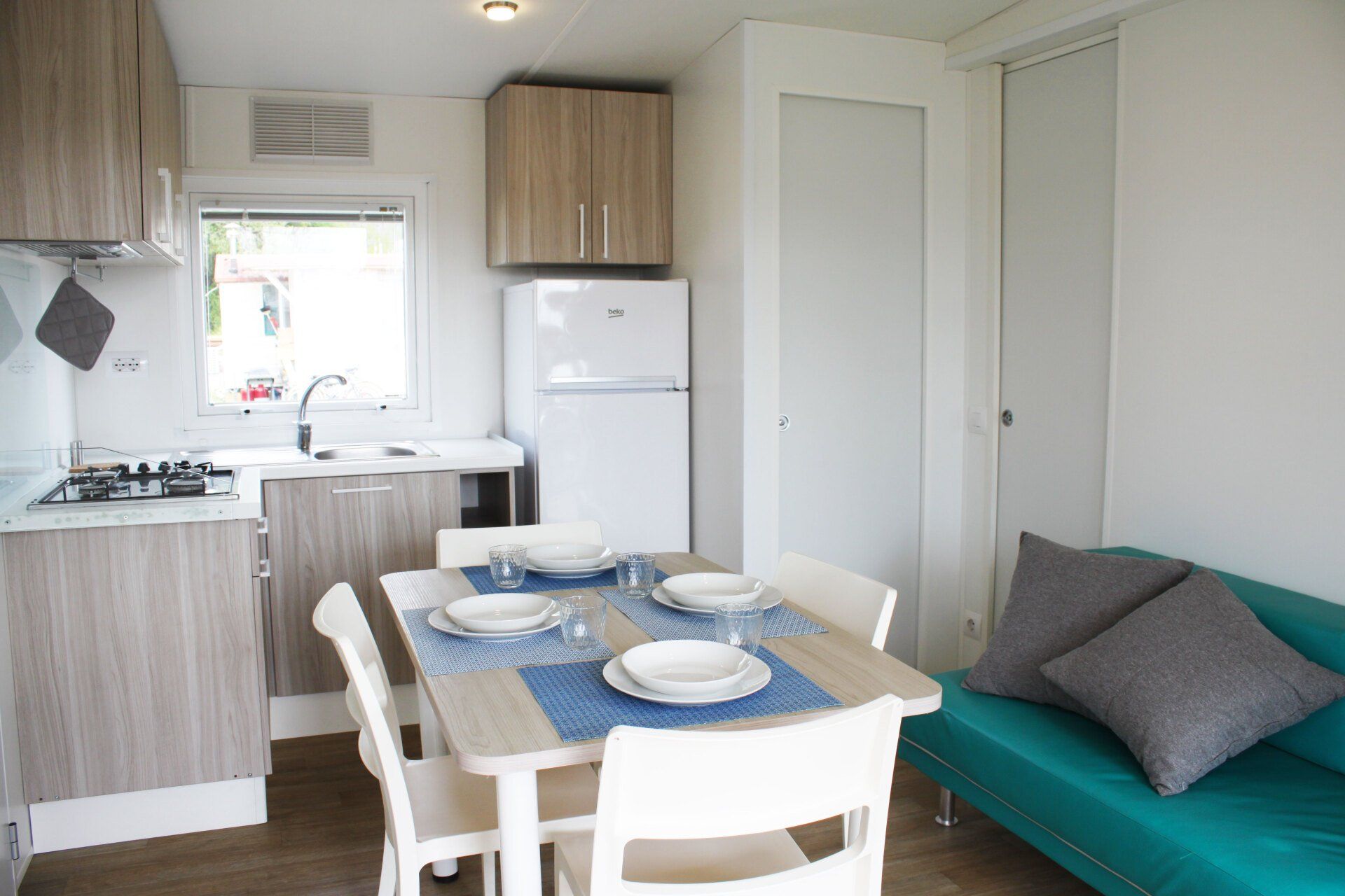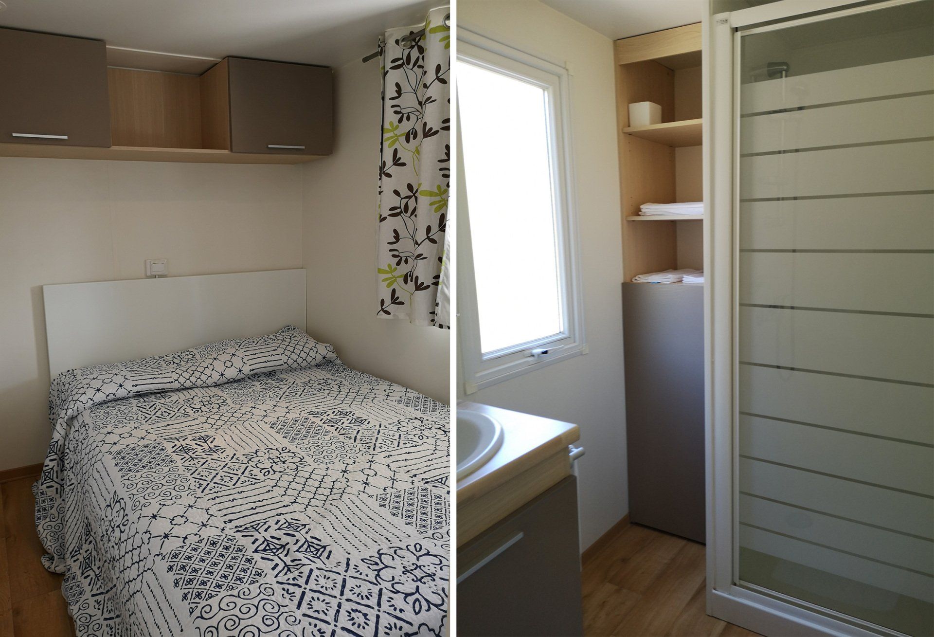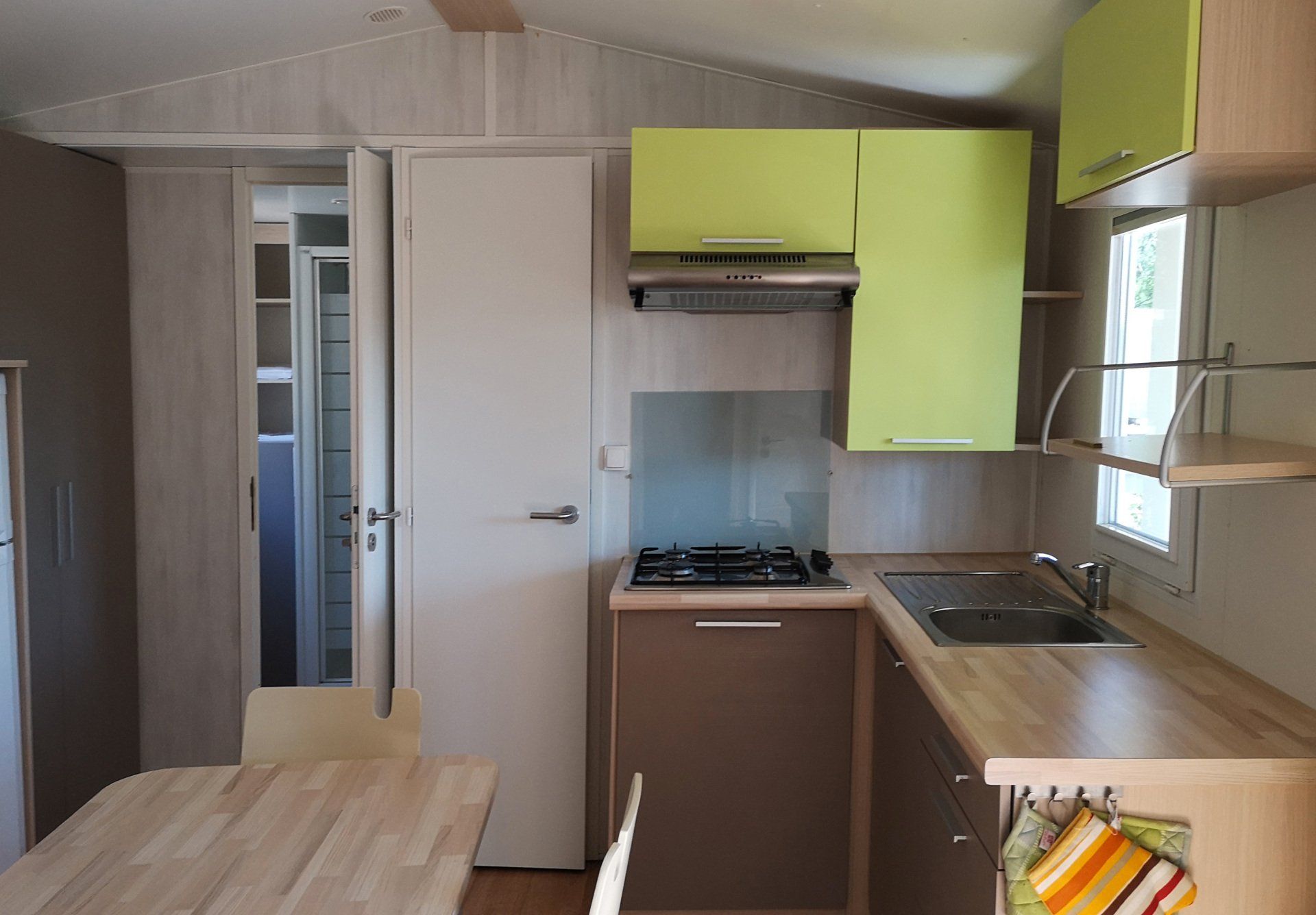 24 sqm caravan with equipped kitchen, 1 double bedroom, 1 bedroom with 2 beds and 1 bunk bed, bathroom with shower.