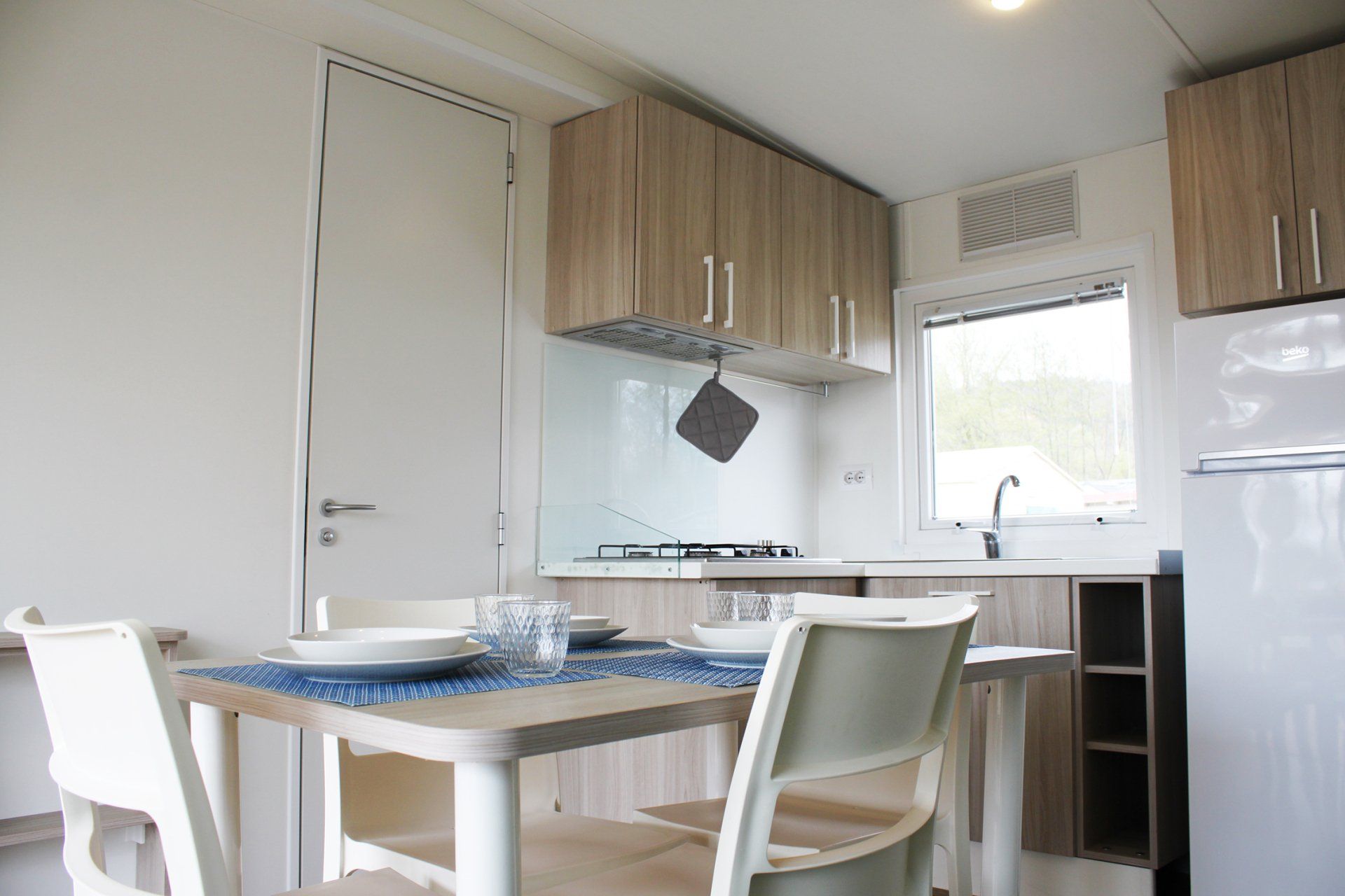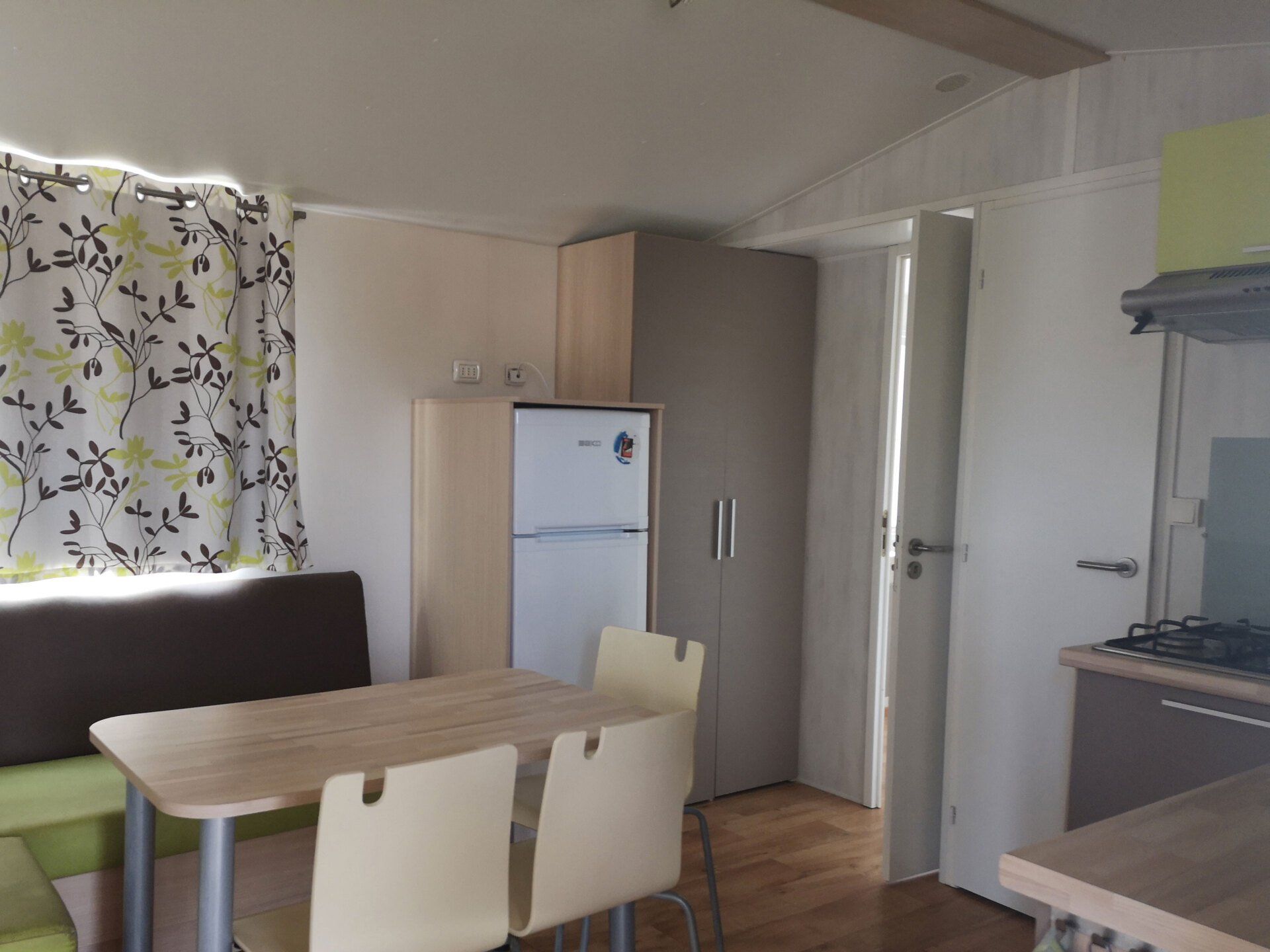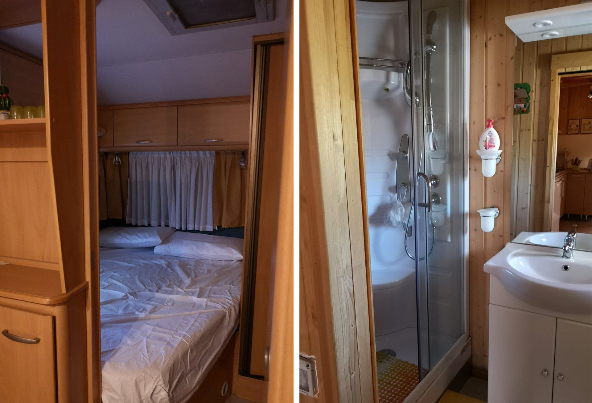 24 sqm caravan with equipped kitchen, 1 double bedroom, 1 bedroom with 2 beds and 1 bunk bed, bathroom with shower.