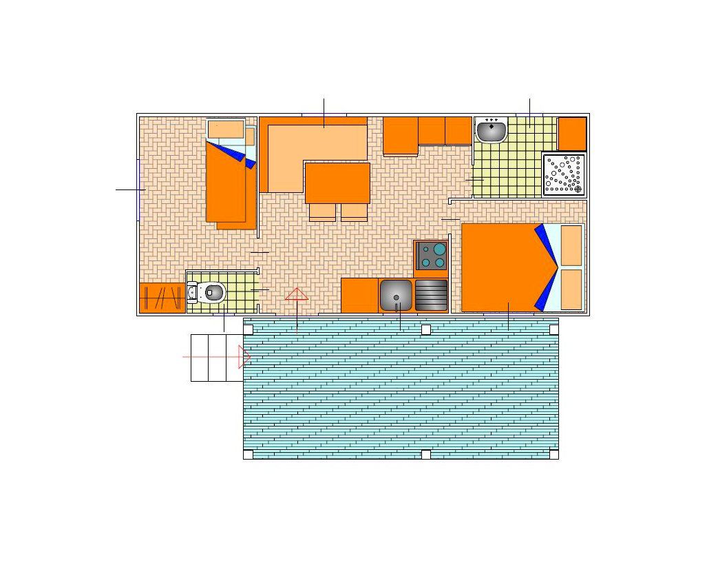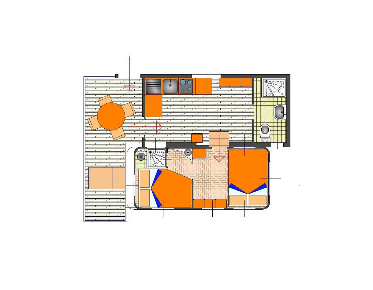 The caravan has a fully-equipped kitchen, a sofa, 2 bedrooms with single beds, and a complete bathroom with shower. This type of caravan has a large veranda with table, chairs and barbecue. It is equipped with heating and air conditioning.