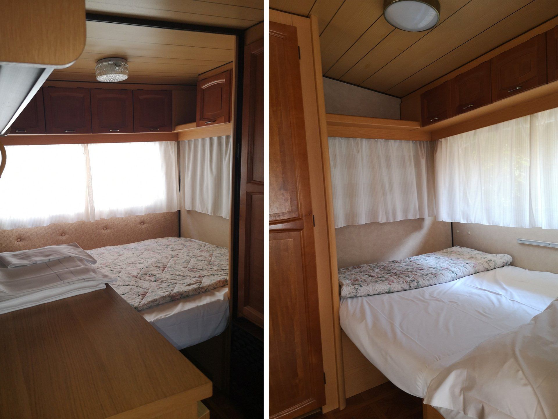Caravan of 24 square metres with equipped kitchen, 2 double bedrooms with queen-size beds, service bathroom and indoor living room.