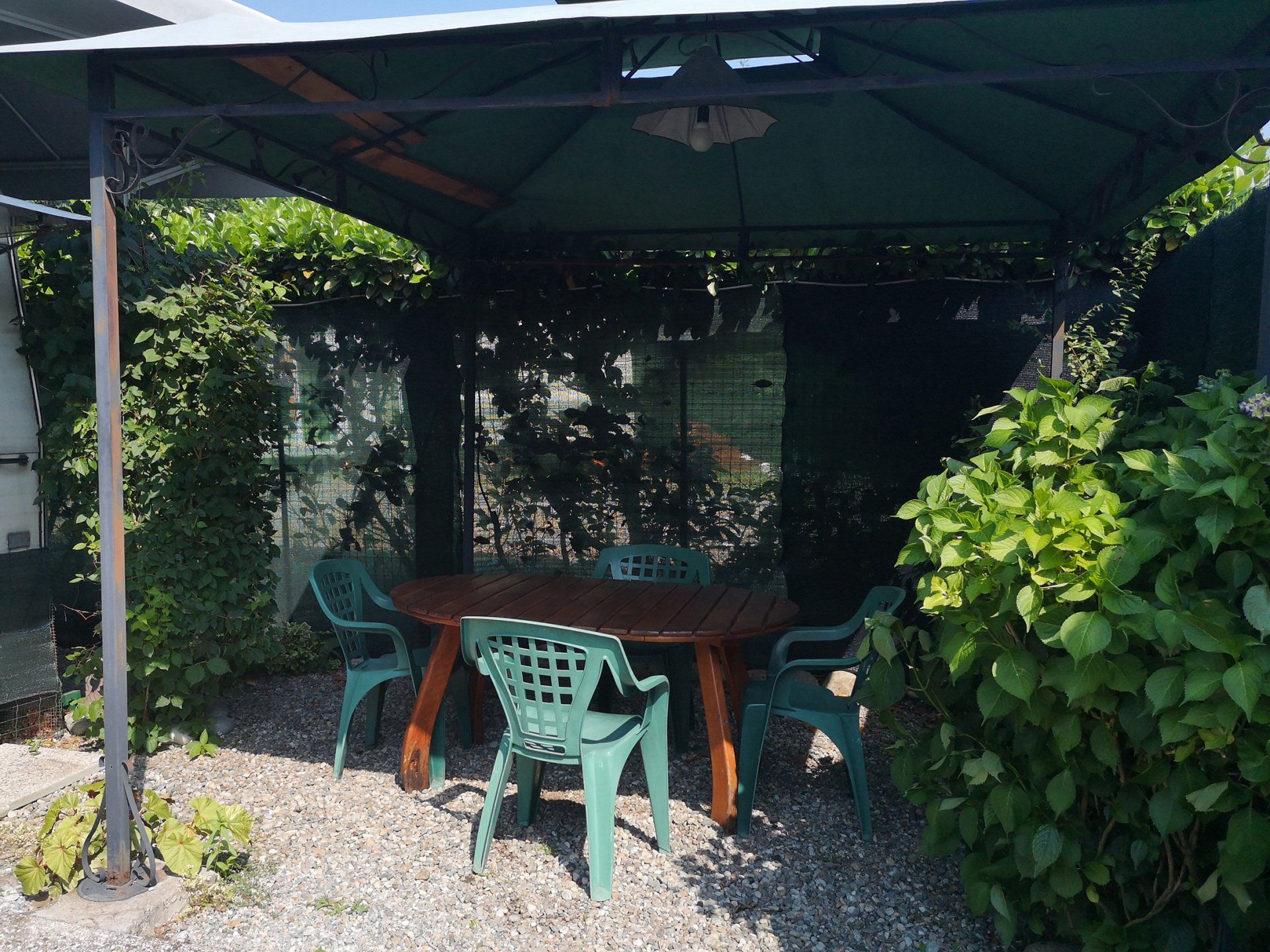 The caravan has a gazebo with table and chairs.