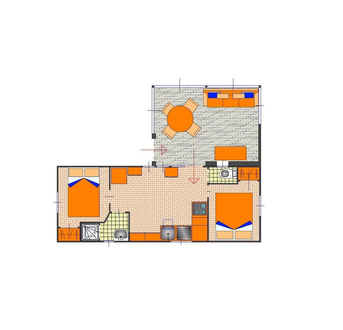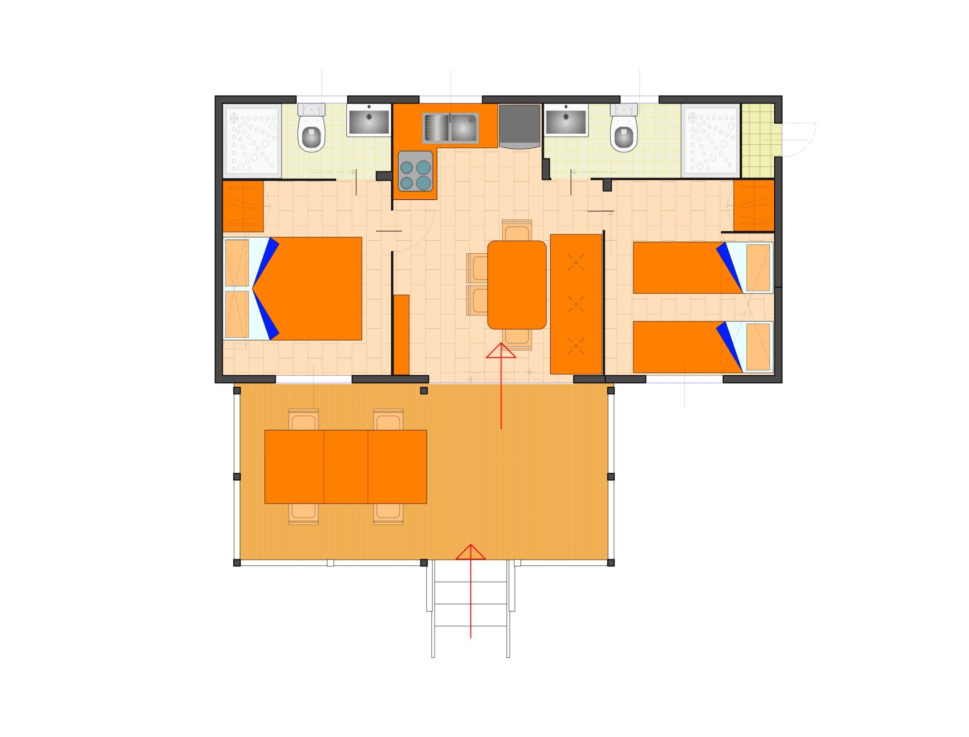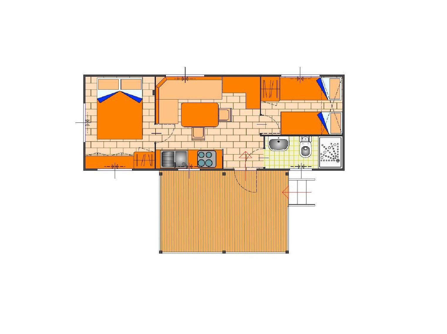 32 sqm maxi caravan with equipped kitchen, 1 double bedroom, 1 bedroom with 2 beds and 1 bunk bed, 2 bathrooms with shower.