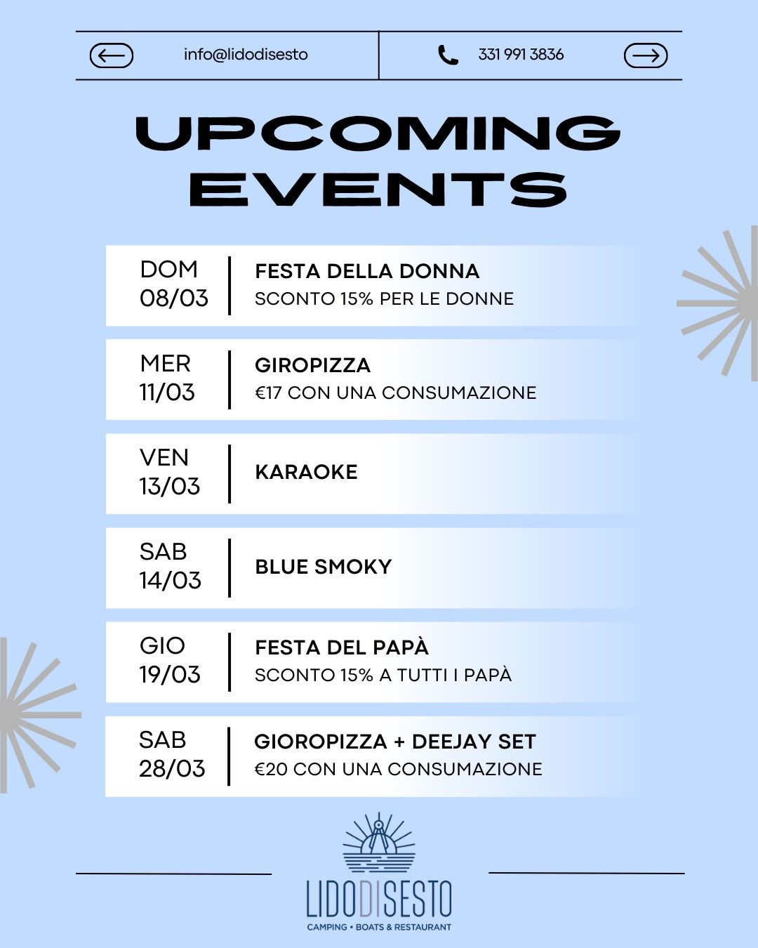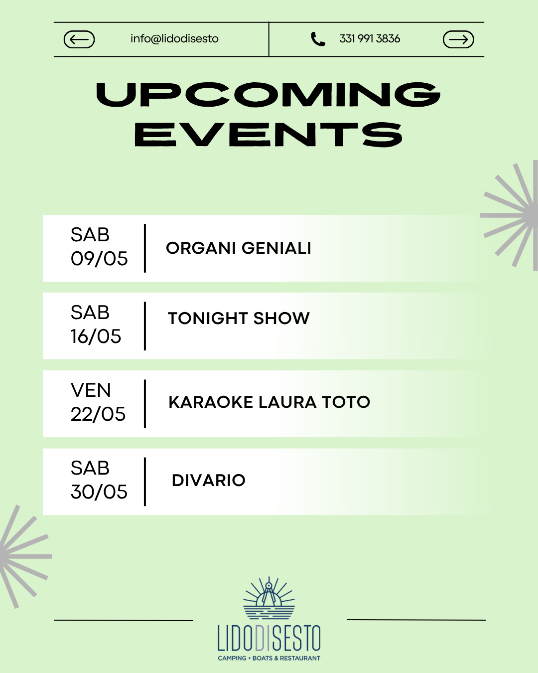 In questa pagina, inoltre, potrai visualizzare tutte le notizie e gli aggiornamenti inerenti l'attività del Lido.