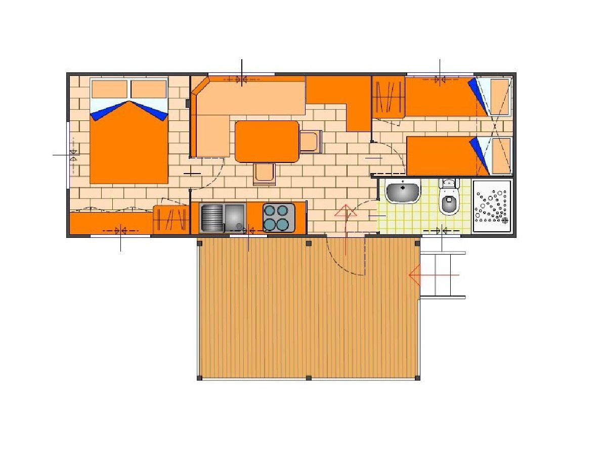 Le mobil-home Maxicaravan P30 est équipé d'une cuisine équipée avec kitchenette et réfrigérateur, d’une table avec canapé, 1 chambre double avec lit d’une place et demi, 1 chambre avec 1 lit superposé, une salle de bain complète avec douche et climatisation. Ce type de mobil-home dispose également d'une agréable véranda privée en bois équipée d'une table et de chaises.